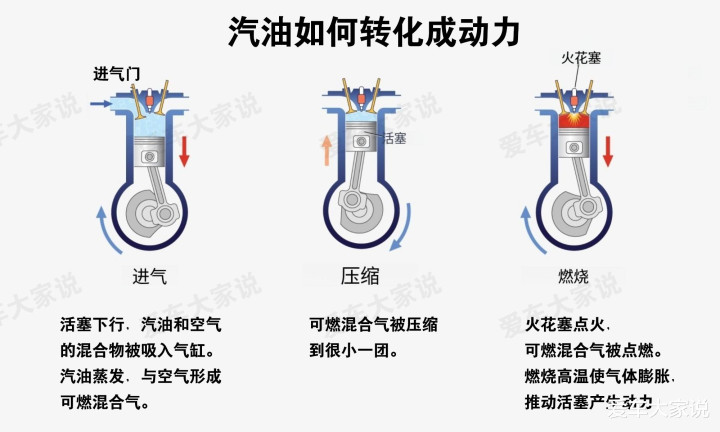 汽油燃烧怎么产生动力的:汽油进入发动机后与空气混合形成可燃混合气。压缩冲程活塞把可燃混合气压到很小的一团,然后火花塞点燃,混合气燃烧释放大量热,气体受热膨胀推动活塞产生动力。